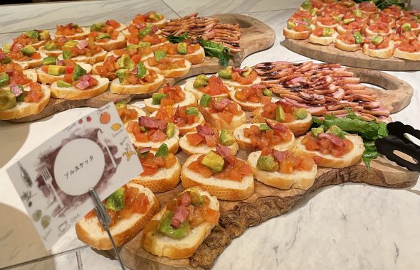 【カウンター】料理やお酒が並ぶスペース、ゆったりと立食ができる高さ。